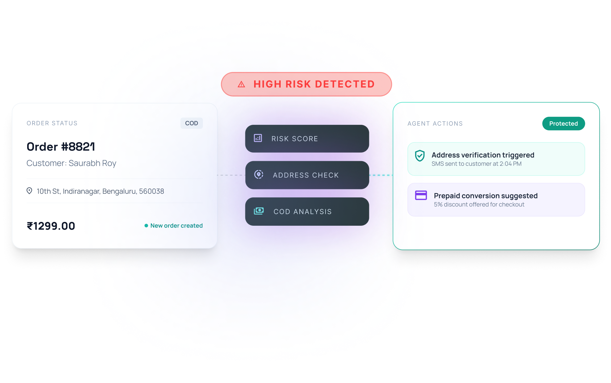 The agent scores every COD order for return risk the moment it is created. It automatically intercepts high-risk shipments and triggers address verification or prepaid switches before the label is printed.